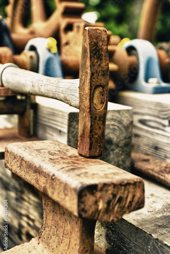 hammer, tool, work, vintage, equipment, anvil, repair, metal, industry, object, hardware, obsolete, handle, symbol, renovation, old, fix, machinery, material, stone, wood, sledgehammer, blacksmith, heavy, skill, iron, past, rust-eaten, useful, history, nostalgia, antique, texture, plank, construction, collection, handiwork, mallet, cast iron, carpenter, steel, closeup, craft, manufacturing, metalwork, evolution, icon, retro, forge