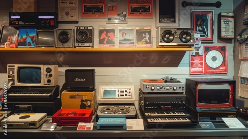 vintage, audio, equipment, music, device, record, player, speaker, synthesizer, collection, nostalgic, retro, gear, ambient, lighting, display, shop, electronic, vinyl, turntable, cassette, tape, radio, amplifier, 90s, nostalgia, sound, studio, technology, old, classic, antique, entertainment, stereo, instrument, mixer, earphones, gramophone, system, analog, interior, treble, bass