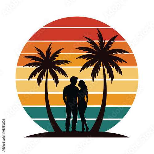 Vintage Beach Couple Silhouette Vector - Romantic Retro Design with Sunset & Ocean, Minimalist Love Art