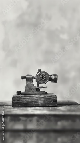 Vintage black and white photo of an antique machine on a wooden table, with a blurred background. Ideal for retro themes and history enthusiasts.