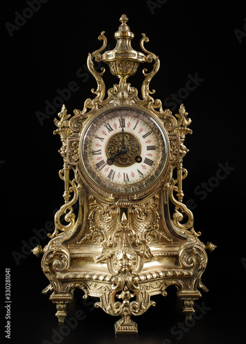 vintage bronze watch , antique clock photo on black background, bronze fireplace clock, eight o'clock on the dial