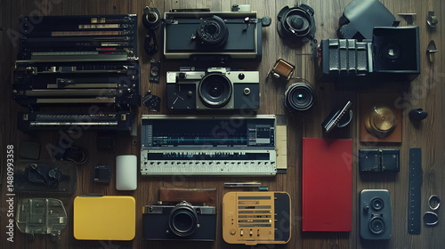 vintage, camera, photo, equipment, collection, analog, film, retro, technology, still, life, dark, wooden, table, top, view, accessory, lens, old, classic, photographic, wood, texture, object, of, camera, flat, lay, tool