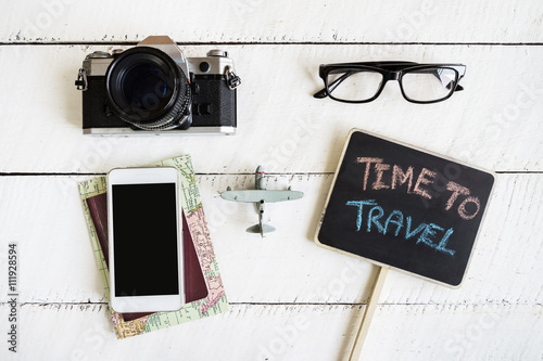 travel, outfit, journey, passport, destination, map, concept, holiday, toy, vintage, camera, note, vacation, globe, background, copy space, planning, accessory, white, wood, lifestyle, expedition, voyage, tour tourism, wooden
