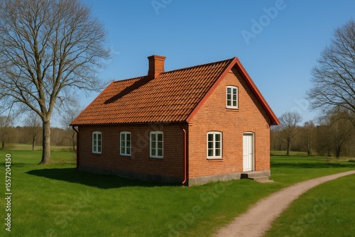 Vintage cottage nestled in rural landscape during springtime in 2020, featuring a vibrant red roof and lush greenery under a bright blue sky.