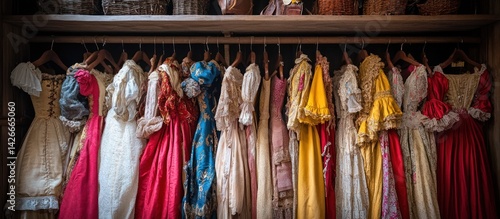 dress, closet, vintage, clothing, costume, fashion, historical, clothes rack, hanging, colourful, elegant, collection, display, theatre, costume, garment, ornate, stylish, beautiful, period, antique, dress, fashionable, fabric, design, showcase, traditional, accessory, european, retro, luxury, victorian, rococo, renaissance