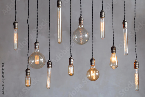 Vintage edison bulbs hanging against gray background illuminating with warm light