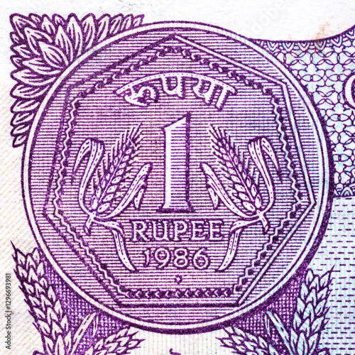 Vintage elements of old paper banknotes.Bonistics.1 rupees bank note of India 1986. Rupee is the national currency of India.Fragment banknote for design purpose.