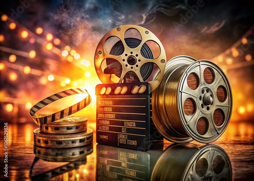 Vintage Film Reels and Clapperboard on Reflective Surface - Cinematic Movie Production Concept for Film Enthusiasts and Creatives