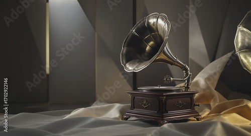 Vintage gramophone on draped fabric, antique music player, retro sound system, nostalgic design