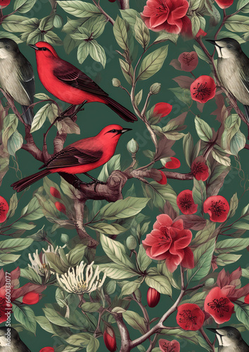 Vintage Illustration of a Scarlet Tanager Amidst Floral Blooms,pattern with birds,background with birds,birds on a branch