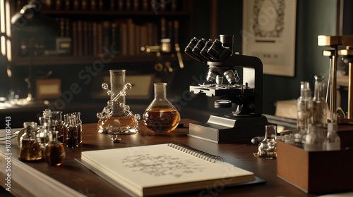 laboratory, microscope, glassware, chemistry, research, desk, vintage, science, beaker, experiment, notebook, brown, light, shadow, workspace, liquid, equipment, academic, study, analysis, educational, retro, desk lamp, book, artifact, tool, oil, exploration, education, antique, heritage, molecular, flask, observation, synthesis, detailed, surface, creative, composition, writing, note, thoughtful