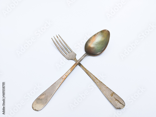 isolated, white, table, spoon, fork, cutlery, utensil, metal, steel, vintage, antique, old, rustic, classic, retro, aged, tarnished, scratched, tableware, kitchen utensile, dining, eating, cooking, household, domestic, culinary, flatware, pair, set, collection, heirloom, traditional, heritage, rust-eaten, worn, decorative, minimalist, simple, isolation, object, tool, equipment, accessory, collectable, silverware, shiny, patina, elegant, craft
