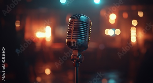Vintage microphone illuminated in a vibrant setting during a live performance at night