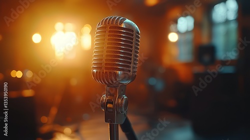 Vintage microphone on stage, music performance, warm lighting, blurred background, concert promotion