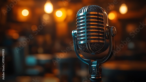 microphone, vintage, retro, music, sing, song, audio, recording, podcast, broadcast, radio, concert, stage, performance, sound, voice, instrument, technology, communication, speak, talk, interview, studio, light, dark, bar, club, pub, bokeh, background, metal, silver, chrome, classic, old, antique, elegant, style, design, professional, journalism, entertainment, show, event, celebration, nightlife, atmosphere, ambience