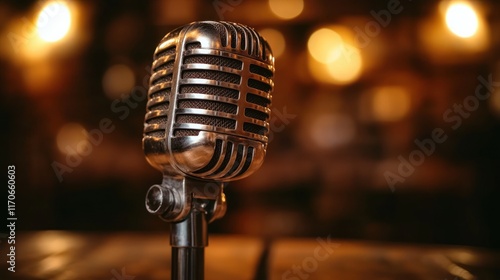 microphone, vintage, retro, music, audio, recording, podcast, singing, voice, broadcast, performance, concert, stage, sound, instrument, technology, communication, old, classic, style, design, metal, silver, lighting, dark, background, bokeh, light, bar, pub, club, event, show, entertainment, karaoke, announcement, interview, speak, talk, speech, lecture, presentation, radio, studio, closeup, object, equipment