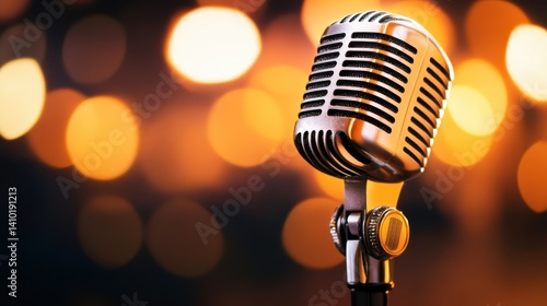 Vintage microphone stands ready on stage with warm bokeh lights creating an inviting atmosphere for performers