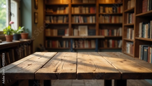 Vintage old Wooden Table in Cozy Library Setting with Blurred Bookshelf in Background for Rustic and Classic Interior Design,Table With Copy Space