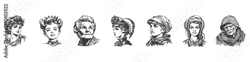 portrait, historical, fashion, diverse, vector, set, individual, vignetting, art, age, vintage, retro, illustration, drawn, woodcut, diversity, expression, classic, attire, period, clothing, artistic, cultural, representation, traditional, wear, old, fashioned, character, study, detailed, antique, look, timeless, heritage, history, expression, evolution, collection, digital, hand, drawing, black, vignetting, isolated, graphic, transparent, background