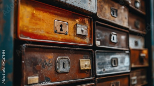 box, vault, safety, deposit, storage, metal, antique, key, security, compartment, wooden, strongbox, closeup, lock, arrangement, interior, detail, old, heritage, bank, access, protection, safe, collector, style, unique, craftsmanship, design, retro, treasure, asset, container, classic, architecture, vintage, rustic, shadow, concept, private, organisation, collection, home, office