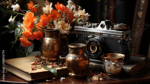 Vintage Still Life with Camera and Flowers