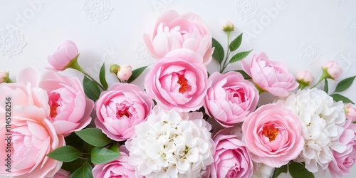 Vintage style artificial flower wall background with delicate roses, peonies, and hydrangeas in soft pastel hues, decorative, roses
