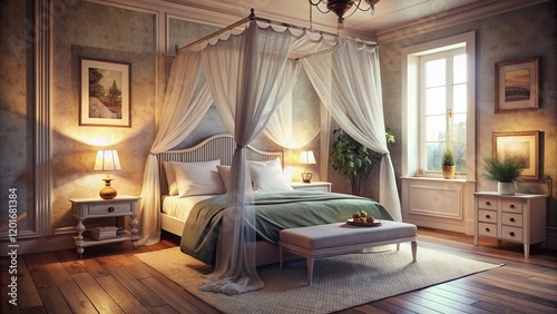 Vintage Style Photo: Modern White Bedroom with Draped Canopy Bed