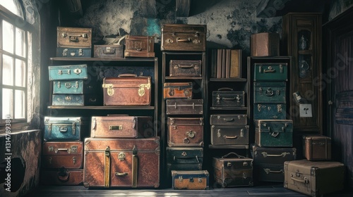 Vintage Suitcases Collection in Dusty Attic Room