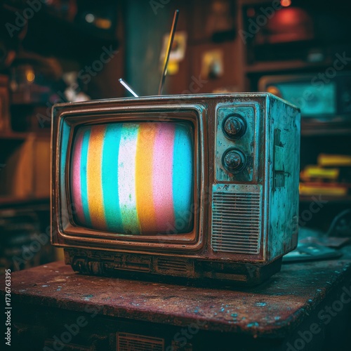 television, vintage, retro, static, screen, display, colourful, wooden, surface, table, technology, old, classic, antique, broadcast, signal, grooved, receiver, electronic, analog, nostalgia, set, image, picture, view, visual, device, appliance, entertainment, media, program, show, content, transmission, reception, wave, frequency, spectrum, hue, tint, tone, shade, colours, brightness, contrast, resolution, pixel, frame