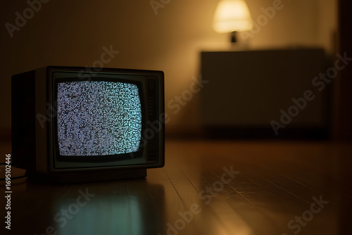 television, static, vintage, retro, analog, screen, noise, old, television, device, technology, electronic, communication, entertainment, display, monitor, crt, wooden floor, floor, wood, grain, plank, lamp, light, glow, room, indoor, furniture, table, dark, night, home, house, domestic, household, living room, nostalgia, past, classic, antique, obsolete, abandoned, forgotten
