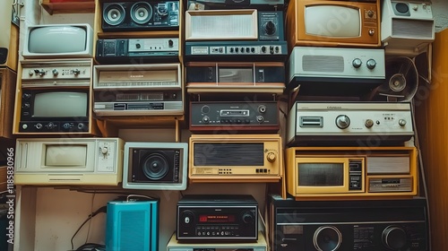 television, radio, stereo, equipment, vintage, retro, antique, electronic, technology, old, classic, nostalgic, collection, stacked, wall, display, audio, visual, media, entertainment, receiver, amplifier, cassette, player, tuner, speaker, console, television, set, screen, tube, dial, knob, buttons, component, device, apparatus, home, system