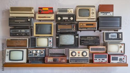 television, television, television, radio, radio, stereo, stereo, vintage, retro, antique, old, electronic, electronic, technology, tech, display, shelf, wall, mounted, collection, assortment, nostalgic, classic, style, design, apparatus, receiver, console, screen, tube, broadcast, sound, audio, visual, image, picture, player, recorder, cassette, tape, media, entertainment, home, past, history, memory, memory
