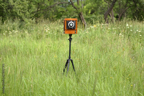 Vintage wooden large format film camera on a sunny meadow with green grass. The old studio camera for using glass plates.
