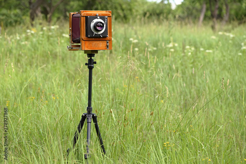 Vintage wooden large format film camera on a sunny meadow with green grass. The old studio camera for using glass plates.