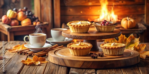 Vintage wooden podium displaying seasonal pies and hot beverages in cozy caf? setting, vintage, wooden, podium, seasonal, pies