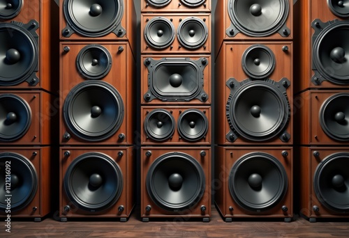 high fidelity, speaker, sound, system, music, equipment, party, loudspeaker, stack, amplifier, vintage, audio, stereo, tower, studio, wooden, cabinet, dj, karaoke, performance, live, concert, home, theatre, retro, design, high, fidelity, amp, tech, entertainment, amplify, volume, bass, loud, band, ai, illustration, generative, speaker, background, black, box, disco, electronic