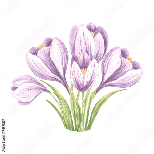 Violet crocus flowers with leaves. Isolated hand drawn watercolor illustration spring blossom saffron. Floral botanical drawing template for card of Mothers day, sticker, wedding, textile, embroidery.