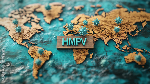 Virus or Viruses Microscopic View of hmpv, showcasing intricate viral details of hmpv virus similiar as covid-19, recently break out hmpv virus, hmpv virus with digital world map visualization.