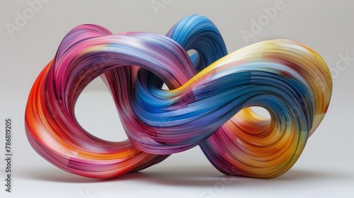 Visualize a 3D abstract sculpture composed of interlocking color bands, each hue vibrant and full of life, weaving together to form a stunning visual harmony.