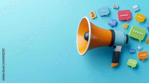 Visualizing the Power of Communication with a Megaphone Engaged by Colorful Speech Bubbles to Enhance Minimalist Messaging Techniques