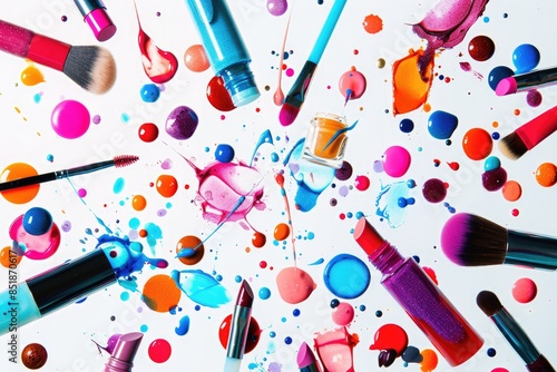 Vivid Beauty Explosion - Colorful nail polishes, makeup brushes, and lipsticks falling gracefully on white backdrop in high-resolution beauty photography