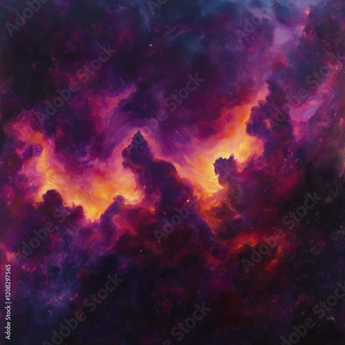 Vivid cosmic scene with swirling purple and orange nebula clouds