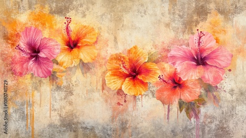 Vivid hibiscus flowers bold shades on heavily textured grunge