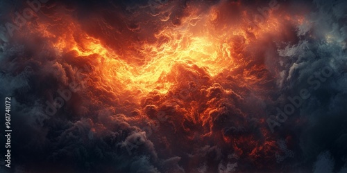 Vivid orange and red flames flickering through dark storm clouds at sunset over a dramatic horizon