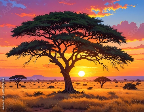 Vivid sunset over African savanna with lone tree, warm hues