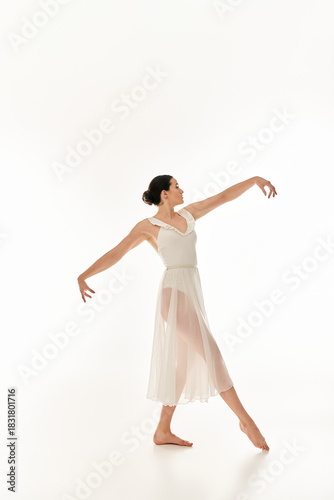 Vivid young dancer performs an elegant acrobatic pose in flowing attire against a light backdrop