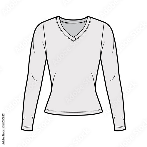 V-neck jersey sweater technical fashion illustration with long sleeves, close-fitting shape. Flat outwear apparel template front, grey color. Women men, unisex shirt top CAD mockup