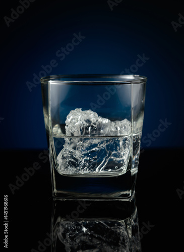 Vodka with ice on a black reflective background.