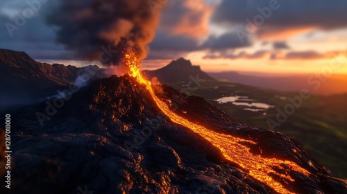 Volcanic Eruption: Dramatic view with lava flow erupting volcano against dark background at sunset