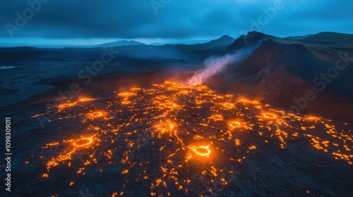 volcanic, eruption, lava, landscape, aerial, view, moody, dark, multiple, breathtaking, distant, erupting, rugged, sky, glowing, mountain, terrain, surrounded, overcast, wind, drone, lighting, filming, region, pattern, powered, solar, explosive, smoke, environment, brightness, crater, volcano, geology, fire, island, geothermal, fume, earth, nature, scenic, ignition, landform